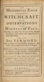 An historical essay concerning witchcraft. With observations upon matters of fact; tending to clear the texts of the sacred Scriptures, and confute the vulgar errors about that point, and also two sermons. One in proof of the Christian religion; the other concerning the good and evil angels / By Francis Hutchinson.