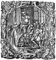 An itinerant surgeon extracting stones from a man's head; symbolising the expulsion of 'folly' (insanity) Line engraving by L. van Leyden, 1524.