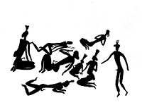 M0004862: Line drawing of a masked man imitating the tusks of a mammoth with his arms, from Les Combarelles
