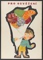 A small boy holding a big cone filled with various kinds of candy. Colour lithograph after R. Vepřek, 1956.