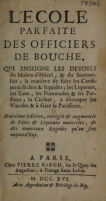 L'Ecole parfaite des officiers de bouche : qui enseigne les devoirs du maître-d'hôtel, & du sommelier ; la maniere de faire les confitures séches & liquides ; les liqueurs, les eaux, les pommades & les parfums ; la cuisine, à découper les viandes & à faire la patisserie.