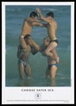 Two men in swimming shorts hold two other men on their shoulders as they stand in the sea; advertisement for safe sex by the Health Education Authority for the National Aids Helpline. Colour lithograph.