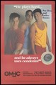 Three men in vests and t-shirts in locker rooms with a condom; advertisement for safer sex by the Gay Men's Health Crisis. Colour lithograph by David Morgan, 1992.