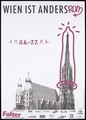 A stippled impression of St Stephen's Cathedral in Vienna with the tower bearing a pink line-drawn condom; with the statement 'Vienna is the other way'; an advertisement for a gay event from 11 June to 7 July [199-] in Vienna [?] organised by sieben zu eins Kulturkontor. Colour lithograph.