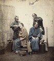 Two Japanese barbers: shaving (left), and hairdressing (right). Coloured photograph.