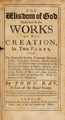 The wisdom of God manifested in the works of the creation. In two parts. Viz. The heavenly bodies, elements, meteors, fossils, vegetables, animals (beasts, birds, fishes, and insects), more particularly in the body of the earth, its figure, motion and consistency; and in the admirable structure of the bodies of man and other animals; as also in their generation, &c. With answers to some objections / [John Ray].