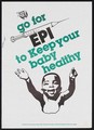 A baby raising its arms towards a needle: Expanded Programme of Immunization in Nigeria. Colour lithograph by Federal DSC Unit, ca. 1995.