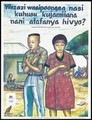 A young man with his arms crossed against his chest and a young woman gesturing with her hands as their woman braids material and their father sits reading a paper beyond; a representing a safe-sex and AIDS prevention advertisement by the Kuleana Centre for Sexual Health in Tanzania. Colour lithograph by Marco Tibasima, ca. 1997.