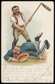 A man beating another man with a paddle in the form of a threshing flail. Colour lithograph, 190-.