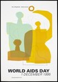 The yellow and green silhouettes of abstract figures with the statement 'Equal rights shared responsibility' representing an advertisement for World AIDS Day on 1st December 1995 by the Folkhälsoinstitutet [National Public Health Institute]. Colour lithograph, 1995.