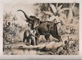 An elephant and her calf ambushed by African men with spears. Lithograph.