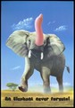 An elephant wearing a condom on its raised trunk runs across a desert; advertising safe sex. Colour lithograph by M. Westrup for Wizard & Genius-Idealdecor AG, 1993.