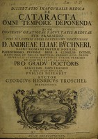 - Dissertatio inauguralis medica de cataracta omni tempore deponenda. Quam consensu gratiosae facultatis medicae sub praesidio viri illustris excellentissimi doctissimi D. Andreae Eliae Büchneri ... pro gradu doctoris legitime impetrando D.XXV.IVLII MDCCLIII publice / defendet auctor Georgius Henricus Troschel Berolinensis.Troschel, Georgius Henricus.Date: 1753