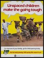 An elderly man gestures towards a man on a bike carrying his family: child spacing and family planning in Nigeria. Colour lithograph by Federal Ministry of Health, ca. 1996.