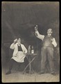 Two sailors pose on stage, holding up a drink. Photographic postcard, 191-.