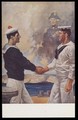 A French and a British sailor clasping hands in front of the spirit of Lord Nelson; representing Anglo-French naval cooperation in World War I. Colour process print, 191-.