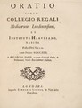 Oratio anniversaria in theatro Collegii Regalis Medicorum Londinensium ex Harvaei instituto habita die xviii Octobris, 1746 / [William Battie].