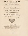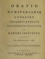 Oratio anniversaria in theatro Collegii Regalis Medicorum Londinensium ex Harvaei instituto habita die xviii Octobris, 1764.