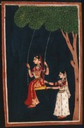 An Indian lady on a swing being pushed by another Indian woman. Gouache painting by an Indian painter.