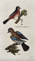 Two birds: a Dartford warbler and a jay. Coloured engraving.