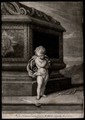 Cupid standing next to a tomb weeping and mourning the death of Queen Mary II. Mezzotint by J. Smith after G. Kneller, ca. 1695.