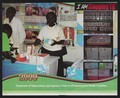 A woman behind a health facility counter displaying anti-tuberculosis drugs with tuberculosis and leprosy posters behind: tuberculosis and leprosy prevention in Kenya. Lithograph by Ministry of Public Health and Sanitation, 2009.