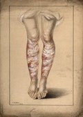 Diseased skin on the legs of a man suffering from psoriasis. Watercolour by C. D'Alton, 1873.
