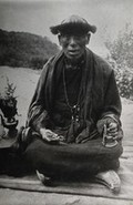 A man (a Buddhist monk?) sitting cross-legged wearing robes and beads and holding a bell. Photograph, 1910/1930.