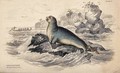 A small nailed seal (phocaleptonyx) sitting on a rock in the sea. Coloured etching by W. H. Lizars.