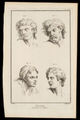 Four faces expressing (clockwise from top left): hatred or jealousy, anger, acute pain and desire. Etching by A-J. de Fehrt after C. Le Brun.