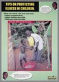 A father assists a boy who washes his hands from a container of water hanging from a branch: preventing illness in children in Uganda. Colour lithograph by Ministry of Health, 2002.
