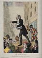 A theatrical itinerant medicine vendor selling his wares on stage to a crowd, assisted by an elaborately dressed man and an owl. Coloured etching.