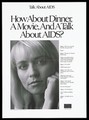 A blonde haired woman looks directly out at the viewer; representation of the risk of AIDS in new relationships with text relating to an interview about how to broach the subject of AIDS on first dates; an advertisement by the U.S. Centers for Disease Control. Lithograph.