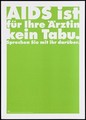 A green background bearing the white lettering: "AIDS ist für Ihre Ärztin kein Tabu. Sprechen Sie mit ihr darüber."[AIDS is not a taboo subject for your doctor. Talk to her about it]; an advertisement by the Swiss Physicians [FMH] and Swiss Federal Office of Public Health [BAG]. Colour lithograph.