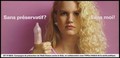 A blond-haired woman holds up a thumb wearing a blown up condom with the statement 'Without a condom? Without me!'; French version of a series of 'Stop SIDA' [Stop AIDS] campaign posters by the l'Aide Suisse contre le SIDA, in collaboration with the Federal Office of Public Health. Colour lithograph.