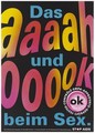 Advertisement for safe sex and the trademark 'OK' quality seal awarded to brand condoms expressed with the words 'aaah' and 'oook' in red and yellow lettering on a black background; German version of a series of Stop AIDS campaign posters by the AIDS-Hilfe Schweiz, in collaboration with the Federal Office of Public Health. Colour lithograph.