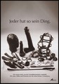 Sadomasochism leather gear including a mask, a dildo, handcuffs, nipple piercing chains, a collar and a whip; advertising safe sex. Colour lithograph by J. Mang and Trash Line Design for the Deutsche AIDS-Hilfe e.V.