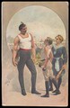 A strongman wearing a white vest and beret is admired by a boy and a girl. Colour process print, 1911.