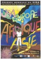A black child chained to a spiked ball raises his hands towards a rising sun with the rising words 'Asie, Afrique, Europe, USA'; an advertisement for World AIDS Day, 1st December 1997 by the Université Victor Segalen Bordeaux 2. Colour lithograph by Jeance Beylot [?], 1997.