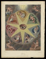 An eye in a star, the spokes of which divide the spectrum of colours; putti hold a prism, a telescope, a rod refracted in water, and a camera obscura; representing optics. Engraving by J. Chapman, 1820, after A.D. Macquin.