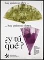 Two fans, one coloured green and open bearing photographs of children and couples, the other purple and closed bearing a photograph of a naked woman crouching by an open window, a fist and a used condom; an advertisement for volunteers working on the AIDS cause by Actua Mollet. Colour lithograph by Isabel Real Gayo and ICS &ICS Publicitat-Mollet, 1995.