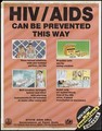 The HIV virus with the silhouette of a couple, 2 people injecting drugs and a blood transfusion; below further illustrations relating to ways in which AIDS is not transmitted including through insect bites and handshaking; a warning about how AIDS is and is not contracted. Colour lithograph, ca. 1995.