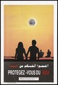 The silhouettes of a couple walking hand in hand against a sunset with a condom representing the sun; a safe-sex and AIDS prevention advertisement by the Programme National de lutte contre le SIDA, Ministère de la Santé Publique, Maroc with assistance from the FNUAP, Maroc. Colour lithograph, ca. 1997.