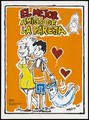 A couple dragging along a condom as though it is a dog on a lead; a safe-sex and AIDS prevention advertisement by Fondo de Población de las Naciones Unidas and Centro Nacional de Educacion para la salud Ministerio de Salud Publica, Cuba. Colour lithograph by Kumand (?), 1995.