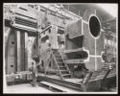 Heavy erecting work for rolling mill engraving, Davy & United Engineering Co. Ltd., Park Iron Works, Sheffield: men are shown operating heavy machinery. Photograph, 1957.