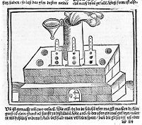 M0011827: Reproduction of a woodcut depicting water-bath distillation possibly from Hieronymus Brunschwig's Liber de arte Distillandi de Compositis, 1512