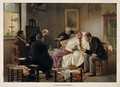 A female patient being hypnotised in front of a group of four men. Colour process print.