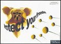 The seed heads of flowers flying like arrows towards the inner stamen of a yellow flower representing 'Love Question No 324', a warning that no pill in the world protects against unwanted sexually transmitted diseases; one of a series of safe sex AIDS prevention advertisements by Folkhälsoinstitutet, RFSU and RFSL. Colour lithograph by Garbergs, ca. 1995.