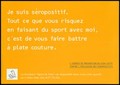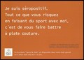 The statement in French "I am HIV Positive. All you risk in playing sport with me, is to be beaten hands down"; an advertisement by L'agence de Prevention du SIDA Lutte contre l'Exclusion des séropositifs. Colour lithograph ca. 1996.
