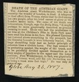 [Newspaper cutting (The Globe, 26 August 1887) about the "Death of the Austrian giant" "Winkelmeyer" (Franz Winkelmeier) in Vienna from tuberculosis].